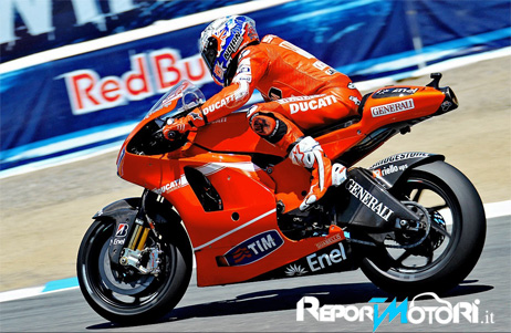 Casey Stoner apre le danze in California nelle libere del venerdì del Red Bull U.S. Grand Prix. L’australiano del team Ducati è uno dei due piloti della sessione in grado di correre sotto la barriera dell’1’22, grazie al tempo di 1’21.699. L’altro è Jorge Lorenzo (Fiat Yamaha) in ritardo di meno di tre decimi di secondo.