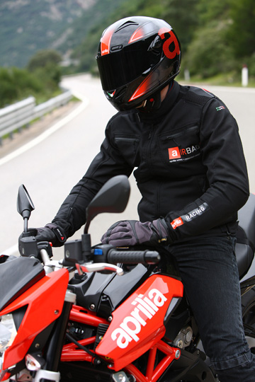 Giacca Airbag nasce nell’interesse dei piloti; una tenuta che garantisce la protezione totale delle zone più a rischio quando si corre sulle due ruote. L’airbag inserito sul retro della giacca si attiva in caso di incidente: con un tempo di apertura di 80/85 millesimi di secondo la salvaguardia della colonna vertebrale è garantita. Le Giacche Airbag di Aprilia, di Moto Guzzi e di Piaggio sfoggiano stile, classe e sportività celando un sistema di protezione semplice ed efficace: un moschettone agganciato con cavo elastico alla giacca viene legato, tramite una cintura per la sella, in dotazione con il sistema airbag, alla moto stessa; il cavo, se strappato con forza, come in caso di incidente, attiva una bomboletta ospitata nel retro giacca. L’emissione di Co2 negli scomparti della veste garantisce la protezione del pilota in meno di un secondo.