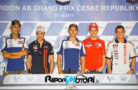 Nel media center del circuito di Brno si sono così dati appuntamento il leader del mondiale Jorge Lorenzo (Fiat Yamaha), il vincitore dello scorso anno e attuale Campione del Mondo Valentino Rossi (Fiat Yamaha), il terzo in classifica generale Andrea Dovizioso (Repsol Honda), il grande assente della scorsa edizione Casey Stoner (Ducati Marlboro) e il rientrante Randy de Puniet (LCR Honda).