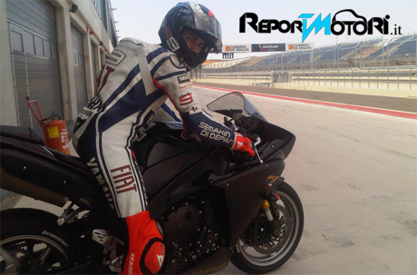 Nell’immagine pubblicata sulla sua fan page, Lorenzo è in sella ad una Yamaha R1 sul circuito di Motorland Aragon, a tre ore da Barcellona, e si diverte con la supersportiva stradale, rigorosamente in versione di serie. Da notare la presenza delle pedane passeggero, dell’impianto frenante e dell’impianto di scarico di serie, etc. . .