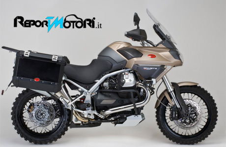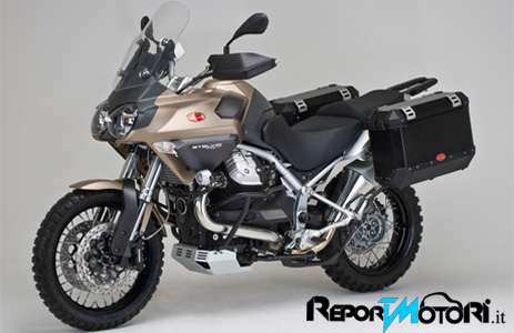 La nuova Moto Guzzi Stelvio 1200 4V NTX segna il punto d’incontro fra la passione per la moto italiana, intesa come l’inimitabile combinazione tra stile, originalità meccanica e piacere di guida e la vocazione per l’avventura, ovvero l’irresistibile attrazione verso mete lontane e impervie. “NTX” non è un nome nuovo nella storia della Moto Guzzi. Già nel 1986, in piena epoca di maratone africane quali Parigi-Dakar e Rally dei Faraoni, la casa di Mandello del Lario fece sua questa sigla per identificare le Moto Guzzi dei grandi viaggiatori, modelli che conquistarono un notevole consenso tanto da esser prodotti per oltre un decennio. Oggi, queste tre lettere ritornano per identificare la versione più specialistica e avventurosa della Stelvio 1200 4V NTX, la moto che ha segnato il rientro della Moto Guzzi nel settore delle maxi enduro. Da questa moderna e tecnologicamente avanzata base di partenza ha preso forma un nuovo concetto di moto no-limits, possente e muscolosa, forte e inarrestabile. Un’immagine generata dalla robusta “corazza” che avvolge le forme della Moto Guzzi Stelvio 1200 4V NTX, composta da paracoppa, paramotore, protezione cilindri, e paramani integrali per preservare il pilota e la sua cavalcatura dalle insidie di qualsiasi percorso. Imponenti quanto efficienti e robuste, le valigie in alluminio e i fari alogeni supplementari completano la sontuosa dotazione d’accessori presenti sulla nuova NTX, incrementabile con una ricca serie d’accessori a richiesta, quali per esempio il navigatore GPS, le manopole riscaldate e, per i più avventurosi, un kit di pneumatici tassellati con il posteriore nella misura di 150/70 R17 montato sulla ruota da 4,25 pollici di serie.