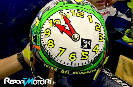 Valentino Rossi ha mostrato un nuovo casco all’inizio della seconda sessione libera di Misano, con un orologio ben visibile sulla testa dell’italiano che segnava l’inizio della prova. L’orario continuerà a cambiare ad ogni sessione da qui fino al termine del Gran Premio Aperol di San Marino e Riviera di Rimini. Il pluricampione del mondo come sempre prende in giro se stesso e per dimostrare ancora una volta il suo grande senso ironico in collaborazione con Drudi pensa un casco dove è chiaro il messaggio che vuole comunicare: ” è tempo di svegliarsi”!