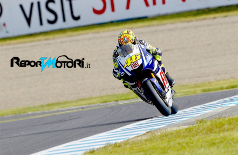 Ottime libere per il Campione del Mondo in carica. Cade Pedrosa e si frattura la clavicola, rincorsa al titolo a rischio.Sessione col brivido a Motegi nelle prime libere della classe regina del 14º appuntamento del calendario: dopo appena tre giri Dani Pedrosa perde il controllo della sua Honda RC212V e finisce al suolo. Costretto a lasciare la pista in barella, lo spagnolo mette seriamente a rischio la propria presenza per la gara di domenica, dopo una doppia frattura alla clavicola sinistra. Con Pedrosa out, Andrea Dovizioso mantiene la Repsol Honda nelle prime posizioni: l’italiano è secondo alle spalle di un super Valentino Rossi capace di trovare il miglior tempo nell’ultima tornata disponibile. Per il pilota Fiat Yamaha il crono di 1’48.174.