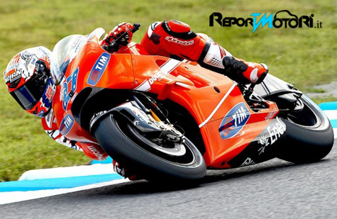 Partenza falsa per il team Ducati ufficiale con l’australiano comunque a tre decimi dal miglior tempo. La caduta non ha invece aiutato l’americano. Oggi Casey Stoner e Nicky Hayden sono tornati in pista per cercare il set up più adatto alle particolari caratteristiche “stop and go” del circuito di Motegi. Alla fine il primo turno di prove libere del Gran Premio del Giappone ha visto i piloti del Ducati Team rispettivamente quarto e tredicesimo, ma entrambi fiduciosi di migliorare domani. In un pomeriggio soleggiato che ha smentito le previsioni di pioggia Stoner, che arrivava dalla bella vittoria di Aragon, ha trovato subito un passo molto veloce. Il suo miglior crono è arrivato al nono di 19 giri, e lo ha mantenuto al comando della classifica dei tempi per tutta la prima mezz’ora e solo alla fine è scivolato un po’ indietro. Hayden, al contrario, ha risolto alcuni problemi tecnici iniziali ed ha costantemente migliorato il suo ritmo prima che una caduta di poco conto interrompesse la sua progressione positiva.