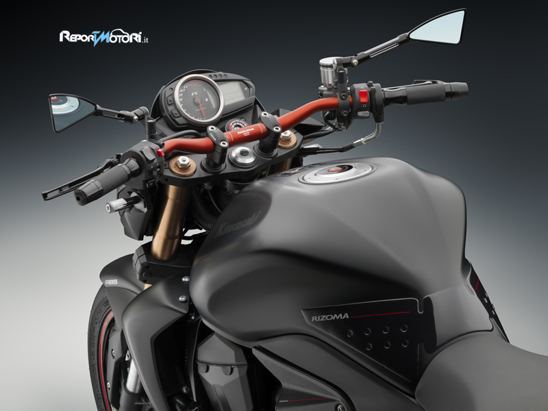arretrati, meritano di essere contemplati. Il materiale principe è ovviamente l’alluminio lavorato dal pieno. Straordinaria la pulizia d’insieme, davvero inarrivabile. Assieme ai prodotti specifici realizzati per questa moto, è inoltre possibile scegliere fra i diversi modelli di specchi retrovisori, indicatori di direzione, manopole e altri numerosissimi accessori. Lo Styling Kit è disponibile sia presso gli showroom Kawasaki europei sia presso i punti vendita Rizoma nei quali ci sarà la possibilità di integrarlo ulteriormente con tutti gli altri preziosi accessori già a catalogo, compatibili con la nuova Z750.