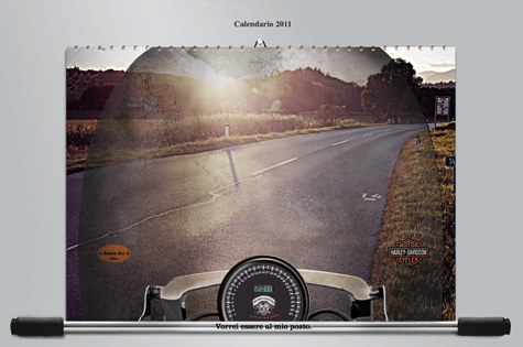 “Vorrei essere al mio posto”, questo il titolo del calendario per il 2011: un vero e proprio inno alla libertà e al mito Harley-Davidson. La prospettiva delle immagini è quella privilegiata del biker Harley: alla guida della storica moto ogni mese è speciale, ogni giorno è un’avventura unica fatta di incontri, momenti, emozioni irripetibili. Da qui l’idea di personalizzare ogni immagine con il manubrio di una Harley: dalla mitica due ruote americana il mondo diventa luogo da scoprire e assaporare, da vivere e ammirare, giorno dopo giorno.