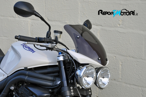 Lo schermo offre una bombatura per migliorare l’efficienza aerodinamica e per aumentare le dimensioni della protezione dietro il cupolino per evitare turbolenze dirette sopra la testa del pilota. È costruito in materiale acrilico con uno spessore di 3 mm. ed è adattabile al cupolino originale Triumph venduto come accessorio originale.