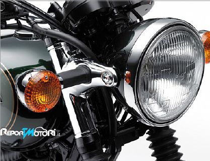 Le ruote di grande diametro e il design compatto della moto creano un prodotto bilanciato dalle proporzioni classiche. Il serbatoio dalle linee arrotondate, verniciato con cura, contribuisce a conferire alla W800 un’aura di