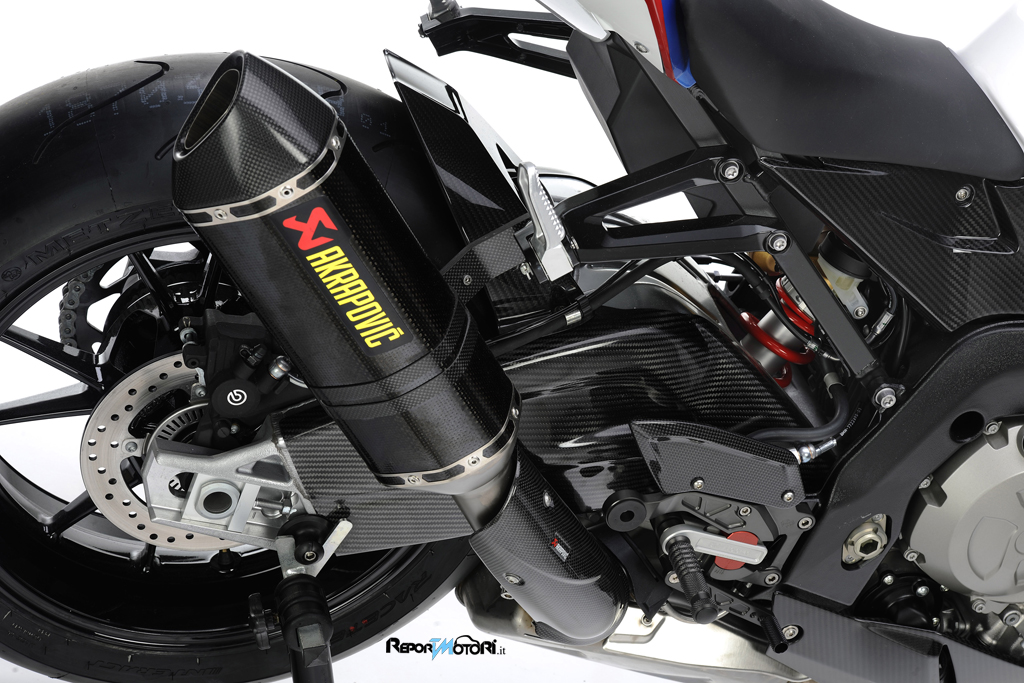 •Terminale di scarico racing Akrapovic (street legal) con supporto in carbonio.