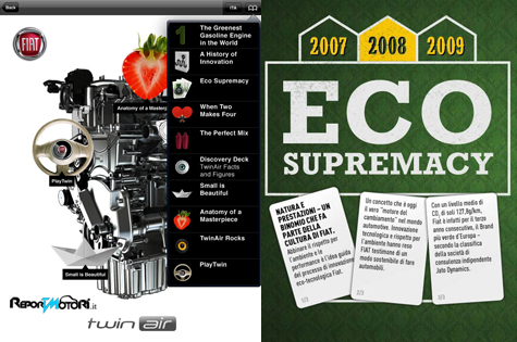 Attualmente proposta in lingua inglese (entro fine ottobre seguiranno italiano, francese, spagnolo e tedesco), l’originale applicazione consente di scoprire, in maniera ludica e interattiva, le caratteristiche innovative del motore: eco-sostenibilità, risparmio, prestazioni e soluzioni tecnologiche all’avanguardia racchiuse in questo gioiello della tecnologia motoristica che si pone come nuovo riferimento del settore. Basti pensare che il TwinAir da 85 CV è il propulsore a benzina turbo con le emissioni più basse al mondo: 92 g/km con cambio robotizzato Dualogic e 95 g/Km con cambio meccanico.