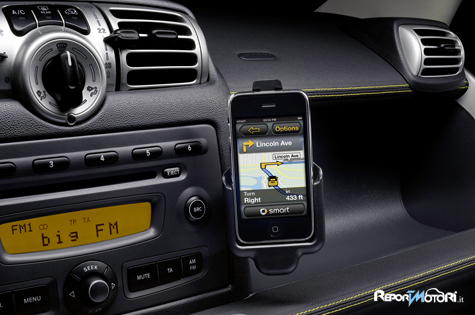 Kit smart drive per iPhone. Più sicurezza, con stile smart è il primo marchio automobilistico che ha sviluppato un’applicazione dedicata all’iPhone. Grazie allo specifico alloggiamento a bordo di smart fortwo, l’iPhone può esprimere al meglio le proprie potenzialità, trasformandosi in un vero e proprio computer di bordo con funzioni multimediali e design ottimizzato per fortwo. L’applicazione smart per iPhone comprende tutte le funzioni utili durante la guida: sistema vivavoce, libreria musicale personalizzata, web radio e sistema di navigazione intelligente. Sono, inoltre, disponibili applicazioni aggiuntive per smart come, ad esempio, il Car Finder, che aiuta a ritrovare la propria vettura all’interno di un parcheggio. La nuova applicazione smart per iPhone coniuga al meglio design e semplicità di utilizzo grazie anche alle generose dimensioni dei tasti. Questa nuova applicazione rende ogni spostamento nel traffico cittadino più agile e divertente, in linea con la filosofia del marchio.