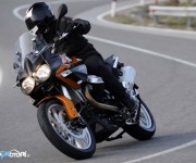 Un nuovo design e tante migliorie per la nuova Moto Guzzi Stelvio, la grande viaggiatrice tuttoterreno di Mandello del Lario. Lo stile è più attraente e moderno, caratterizzato da componenti inedite come il cupolino, il parabrezza, la strumentazione e la semicarenatura con indicatori di direzione integrati, tutti elementi che contribuiscono a donare al frontale della nuova Stelvio un’espressione più aggressiva e dinamica. In termini funzionali ne risultano una più efficiente protezione aerodinamica, grazie al nuovo cupolino, e un’autonomia quasi raddoppiata, garantita dal nuovo serbatoio dalla capacità record di 32 litri. Migliorate anche le prestazioni del celeberrimo bicilindrico trasversale a V di 90° a quattro valvole per cilindro, segno distintivo della “Casa dell’Aquila”, un propulsore capace di esprimere una coppia massima superiore a 113 Nm erogati a soli 5.800 giri/min e di raggiungere agevolmente un picco di potenza di 105 cavalli a 7.250 giri/min. La NTX, versione avventurosa della Stelvio, ne condivide tutte le caratteristiche tecniche ma si differenzia per la robusta “corazza” che l’avvolge, composta da paracoppa, paramotore, protezione cilindri, e paramani integrali. Su Stelvio NTX sono di serie numerosi accessori dedicati ai grandi viaggiatori, come le valigie in alluminio e i fari alogeni supplementari. Stelvio 1200 8V e Stelvio 1200 NTX sono disponibili – entrambe con Abs di serie – al prezzo rispettivamente di €12.990 e € 13.990.