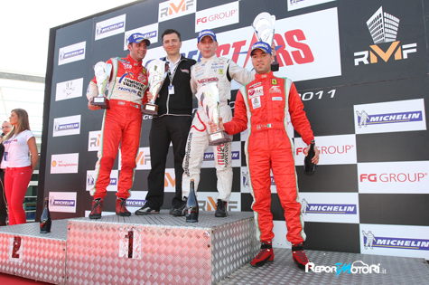 LA CRONACA. Al via scatta meglio dalla seconda fila la Ferrari di Mugelli, il quale mantiene la traiettoria interna guadagnando una posizione e portandosi immediatamente secondo. Il poleman Dalle Stelle scivola invece terzo, mentre è Cressoni a portarsi al comando. All’uscita della Roggia proprio quest’ultimo finisce però in testacoda. Mugelli riesce a schivarlo, mentre Dalle Stelle non può evitare un leggero contatto piegando l’alettone posteriore della sua F430. Mugelli è al comando. Barri e Cirò si ritrovano nell’ordine al secondo e terzo posto. Al quinto giro, nonostante la sua vettura abbia la portiera lato guida mal fissata, Cirò infila Barri all’ingresso dell’Ascari imitato subito dopo anche da Cadei, primo nella classe GTS3 con la Ferrari 458. È lotta accesa a questo punto tra Cressoni e lo stesso Barri, ma al decimo giro fra i due segue un contatto alla Parabol ica. La Corvette di Del Castello si ritrova quarta ed è così che giungerà al traguardo. Da parte di Mugelli, dopo il traguardo, dedica speciale alla moglie Tina e alla figlia Sara, nata sette giorni fa.