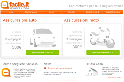 Facile.it racchiude in un’unica url la possibilità di sciogliere i dubbi legati alla scelta dell’offerta migliore nel momento in cui stiamo affrontando alcune delle spese più importanti della nostra vita (ad esempio la richiesta di un mutuo) o che, comunque, incidono maggiormente sul nostro budget personale (l’assicurazione auto, il conto corrente…). Da oggi scegliere è… Facile!