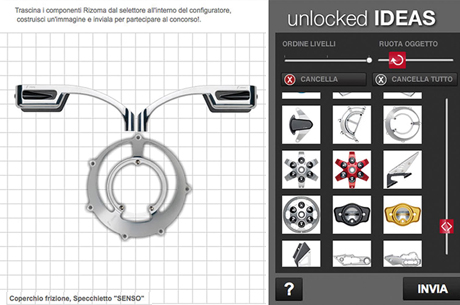A questo punto siete già pronti per cominciare a prendere confidenza con “il configuratore”, un software che permette di combinare a vostro gusto i moltissimi oggetti a disposizione, che altro non sono che immagini raffiguranti una selezione di componenti per moto prodotti dall’azienda, differenti per forma e dimensioni. Cosa si fa con questi oggetti? Si spostano dal loro contenitore al foglio quadrettato che appare sullo schermo allo scopo di comporre un disegno. Il sistema consente di muoverli, ruotarli e inserirli sopra o sotto altri oggetti utilizzati.