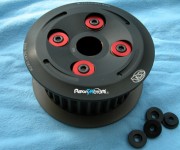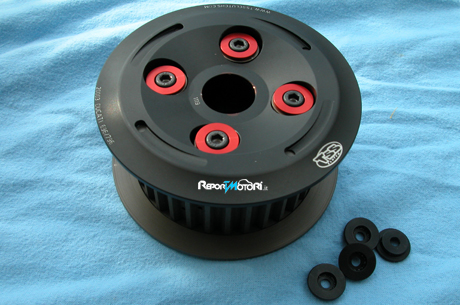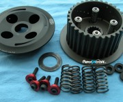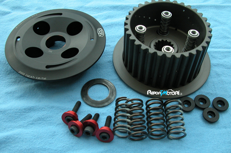 La frizione antisaltellamento di serie si comporta bene nell’uso stradale, ma nell’uso pista-agonistico è necessario un gruppo specifico, per compensare con una reattività maggiore gli effetti delle staccate estreme, scalate veloci di marcia, maggiore velocità di percorrenza della curva, ed eventuali modifiche motore, come la maggiore compressione. Sono quindi necessari una più efficace azione antisaltellamento, risposta più rapida e re-innesto meno brusco. La frizione TSS ha rampe meno inclinate ed un funzionamento uniforme. Grazie alla possibilità di scegliere il numero di molle secondarie o il disegno dei bicchierini di ritenzione molla il pilota può regolare in dettaglio il funzionamento del gruppo per meglio assecondare il proprio stile di guida e le condizioni della pista. Inoltre il vantaggio di peso è notevole, con risparmio di energia rotativa e effetto giroscopico, con l’effetto di una migliore risposta del motore. Il gruppo è realizzato in Ergal 7075.