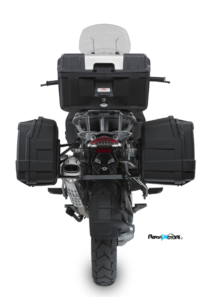 • le nuove valigie squadrate laterali e posteriore Garda caratterizzate dagli inserti in color alluminio e dalla robustezza che ci si aspetta da questo tipo di prodotto, destinato a proteggere i bagagli nel corso di viaggi impegnativi. Garda è disponibile nelle misure da 33 e da 46 litri, utilizzabili sia lateralmente che posteriormente. Prezzi al pubblico: KGR33 186 euro. KGR46 195 euro. (accessoriabili con borsa morbida interna per il bagaglio TK756);