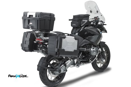 • le nuove valigie squadrate laterali e posteriore Garda caratterizzate dagli inserti in color alluminio e dalla robustezza che ci si aspetta da questo tipo di prodotto, destinato a proteggere i bagagli nel corso di viaggi impegnativi. Garda è disponibile nelle misure da 33 e da 46 litri, utilizzabili sia lateralmente che posteriormente. Prezzi al pubblico: KGR33 186 euro. KGR46 195 euro. (accessoriabili con borsa morbida interna per il bagaglio TK756);