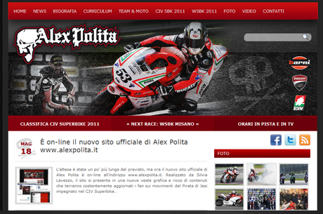 L’attesa è stata un po’ più lunga del previsto, ma ora il nuovo sito ufficiale di Alex Polita è on-line all’indirizzo www.alexpolita.it. Realizzato da Silvia Lavezzo, il sito si presenta in una nuova veste grafica e ricco di contenuti che terranno costantemente aggiornati i fan sui movimenti del Pirata di Jesi impegnato nel CIV Superbike nonché in alcune prove del Mondiale Superbike come wildcard in sella alla Ducati del Barni Racing Team.