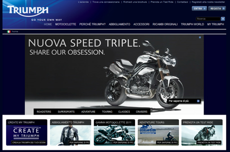 Il nuovo sito Triumphmotorcycles.it, permette agli appassionati del marchio inglese di poter accedere ad una serie di informazioni sul mondo Triump, come ad esempio la gamma di modelli 2011, o la possibilità di poter personalizzare live una Triumph o ancora quella di scoprire tutte le iniziative DemoTour 2011.