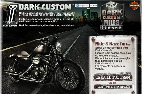 L’ultima novità proposta dal mondo Facebook di Harley-Davidson Italia è l’applicazione Dark Custom Miles. Un gioco, una sfida misurata in chilometri tra i modelli che escono direttamente dalla scena motociclistica più underground. Partecipare è semplice e divertente. Basta cliccare sul logo Dark Custom Miles per accedere al gioco, scegliere un modello della gamma Dark Custom™ e creare un team di amici con i quali condividere il viaggio. Più amici accettano, più si percorrono miglia con la propria moto guadagnando passi alla vittoria.