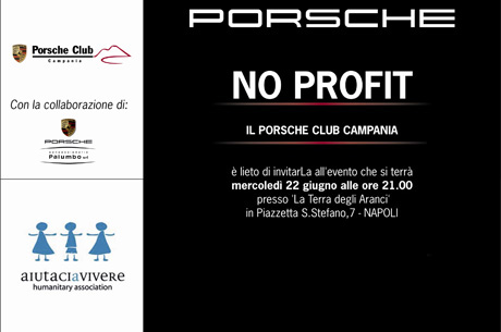 “Porsche No Profit” è il primo evento di beneficenza patronicinato dal Porsche Club Campania. La data è stata fissata per mercoledì 22 giugno 2011 e come location è stata scelta la “Terra degli Aranci” in piazzetta S.Stefano che si trova alle spalle di Piazza Europa a Napoli.