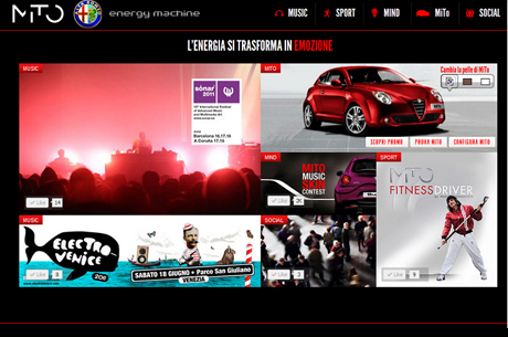 Totalmente “iPad compliant”, adatto quindi ad essere navigato sui nuovi tablet, e contraddistinto dal claim “L’energia si trasforma in emozione”, il sito si articola attraverso 5 sezioni principali. Si parte dalla pagina “Music”, con tutti gli eventi e i festival di musica elettronica nazionali e internazionali di cui MiTo è partner, per continuare con la sezione “Sport” che propone gli eventi e le iniziative del fitness e del Campionato del Mondo SBK 2011 sponsorizzate da MiTo. La terza area, denominata “Mind”, è dedicata alla creatività con il concorso di design che vede gli studenti dello IAAD di Torino cimentarsi nella creazione di grafiche della vettura ispirate alla musica. Completano la navigazione la sezione “MiTo”, dove scoprire il modello attraverso il configuratore e la gallery fotografica, e quella “Social” che presenta i progetti nel mondo dei social network di Alfa Romeo e tra questi segnaliamo l’innovativo Social NetWall, l’aggregatore di tutti i contenuti del brand presenti sui canali social più conosciuti.