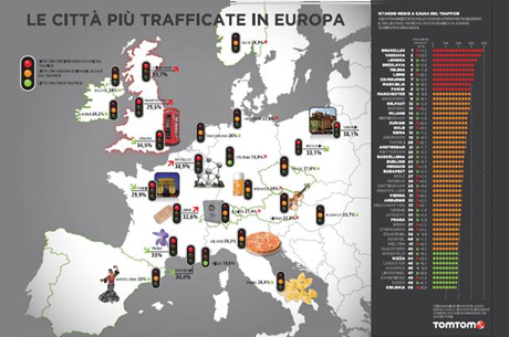 Per la classifica delle 50 città più trafficate d’Europa e la relativa percentuale di strade congestionate, consultare la grafica.