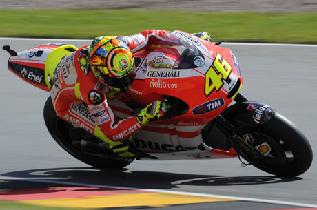 Un fine settimana molto difficile per Valentino Rossi e la sua Ducati GP11.1, alle prese con un tracciato, quello del Sachsenring, difficile e ostile alle caratteristiche della Ducati MotoGP. Dopo il Mugello, Rossi in più interviste aveva dichiarato che lo sviluppo della sua GP11.1 è ancora lungo e difficile,ed il Gran Premio della Germania ha testimoniato la veridicità delle sue parole. Le molte curve a sinistra e le variabili condizioni climatiche, hanno reso il Sachsenring una pista “nera” per Valentino Rossi che già nelle qualifiche dimostrava di non gradire questo tracciato. Partito dalla sedicesima posizione, Valentino Rossi ha condotto una gara all’insegna della rimonta e della ricerca dei punti. Il suo recupero, partito bene, si è però arrestato davanti ad Alvaro Bautista (Team Suzuki) ed a Nicky Hayden (Team Ducati MotoGP), i quali non hanno da subito gradito la rimonta del pluricampione del mondo. Rossi ha tentano più volte di superare Hayden, che si trovava in settima posizione, e Bautista, ma il tutto non ha dato i frutti desiderati.