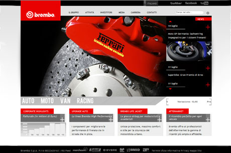 Ben evidente in home page il collegamento con social network: Facebook, Twitter, Youtube, attraverso i quali Brembo, unica nel settore della componentistica, ha instaurato un dialogo diretto con i clienti finali.