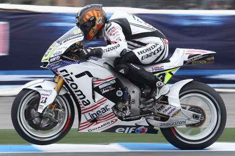 Monterey, 23 Luglio: il pilota del Team LCR Honda MotoGP Toni Elias partirà domani dalla 17° posizione in griglia per il GP degli Stati Uniti davanti al suo compagno di squadra Americano Ben Bostrom che si è qualificato 18° al termine delle qualifiche sul tracciato di Laguna Seca. Il secondo giorno di prove è iniziato con un meteo tipicamente Nord Californiano (21° gradi sull’asfalto) e lo Spagnolo non è riuscito a migliorare il suo crono di ieri dopo una caduta alla curva 11. Fortunatamente il Campione della Moto2 è uscito indenne dalla scivolata ed è tornato in pista nei 60 minuti di qualifiche del pomeriggio che si sono svolte con una temperatura più mite. Nonostante qualche modifica alla geometria del telaio della sua RCV Elias non è riuscito a sfruttare al meglio il turno con le gomme morbide mentre Bostrom ha continuato il suo processo di adattamento alla Honda sull’asfalto di casa sua.