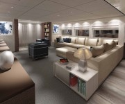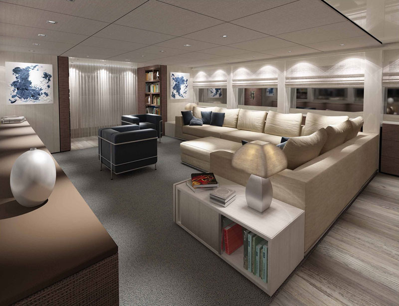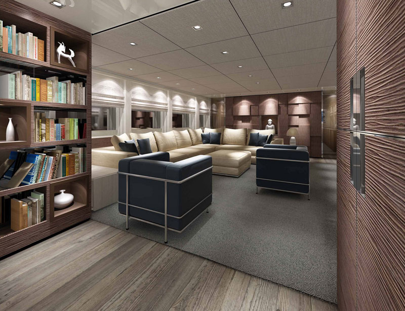 Per la definizione degli interni di questo primo esemplare, firmati da Francesco Paszkowski, l’armatore ha scelto uno stile moderno, di grande sobrietà formale, ma connotato da una grande ricchezza di materiali: tutti i legni sono naturali e trattati tridimensionalmente: le paratie sono in rovere sbiancato e piallato, mentre gli elementi di arredo in legno hanno un effetto “essenza tessuto”. I pannelli invece sono laccati in colore metallescente.