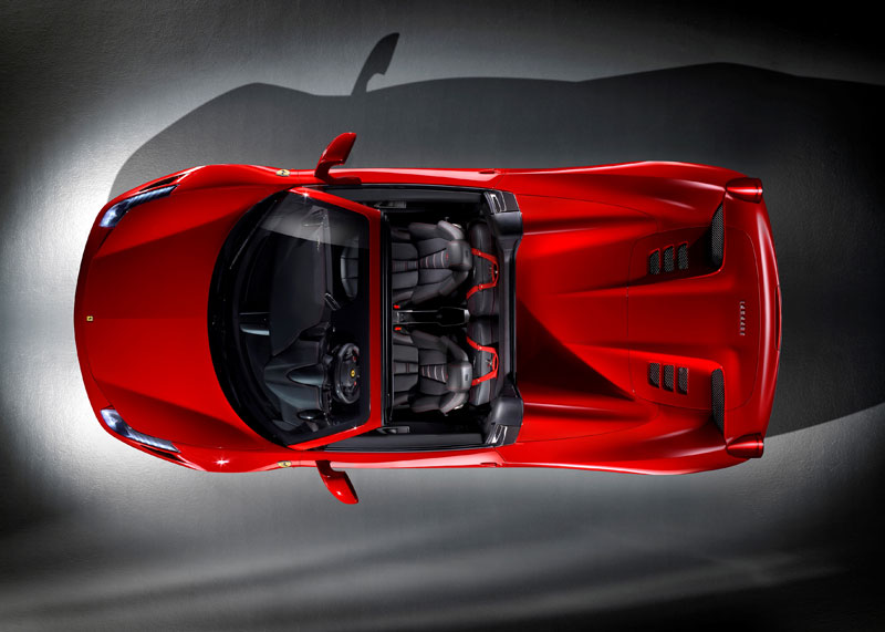 La Ferrari 458 Spider arricchisce la gamma delle 8 cilindri Ferrari a motore posteriore-centrale, affiancandosi alla pluripremiata 458 Italia con la quale condivide i più avanzati contenuti tecnologici distinguendosi per un eccezionale handling e prestazioni elevate. La nuova spider è dotata di tetto rigido ripiegabile, una prima mondiale per una vettura con questo tipo di architettura, che utilizza un’innovativa soluzione brevettata dalla Ferrari. La 458 spider è spinta dal motore V8 ad iniezione diretta da 4499 cm3 e 570 CV vincitore del premio International Engine of the Year 2011, assegnato per l’eccellenza ingegneristica in termini di guidabilità, prestazioni, efficienza e raffinatezza progettuale. Il sistema di trasmissione è costituito dall’ormai celebre cambio F1 doppia frizione a 7 marce con comandi al volante, mentre la dinamica veicolo è gestita dall’E-Diff3, che integra il controllo di trazione F1-Trac e l’ABS prestazionale. Le calibrazioni delle nuova vettura, come la mappa pedale acceleratore e la taratura dello smorzamento delle sospensioni multi-link, sono state progettate per assicurare la massima sportività e il più appagante piacere di guida con il tetto aperto, come vuole la tradizione delle esclusive spider di Maranello.