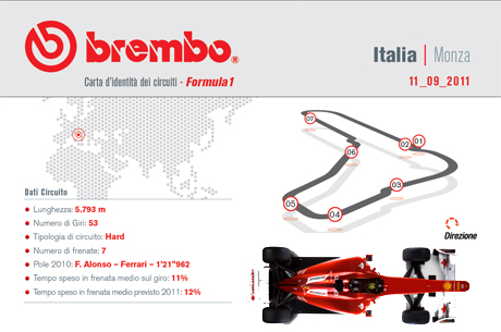 La Formula 1 sbarca in Italia e precisamente in un circuito che è considerato uno dei tracciati più impegnativi ma al tempo stesso “emozionante” del Campionato. Conosciuto dagli appassionati come il “tempio della velocità”, quello di Monza è un tracciato molto impegnativo che mette a dura prova l’impianto frenante delle monoposto. Essendo stato realizzato all’interno di un parco, l’autodromo presenta una caratteristica particolare: infatti quando i piloti passano nelle zone alberate devono tener conto della differenza di visibilità causata dall’ombra delle piante. Secondo i dati dichiarati dalla Brembo, azienda leader a livello mondiale in impianti frenanti, le monoposto di quest’anno, nel punto più veloce del circuito di Monza dovrebbero raggiungere una velocità massima di 330 km/h con una decelerazione pari a 5G!