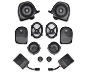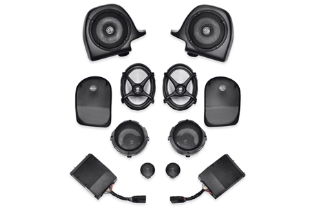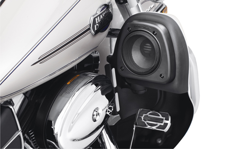 Introdotto per la prima volta sul modello CVO Street Glide, questo impianto stereo completo e full optional, è progettato per garantire massima pulizia e qualità del suono, analoga a quelle delle sale da concerto. Gli altoparlanti, montati su carenatura, carenatura inferiore e borse laterali, sono studiati per dirigere il suono verso il centro della moto e si combinano offrendo a guidatore e