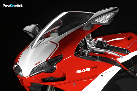 La 848EVO MY2012 mantiene la tradizionale colorazione rosso Ducati, con telaio rosso e ruote nere, il bianco “white artic” con telaio e cerchi in rosso e la versione “dark stealth”, con telaio nero racing e ruote nere. Novità del MY2012 è l’848EVO Corse Special Edition, con livrea rossa, bianca e nera con telaio rosso e cerchi neri.