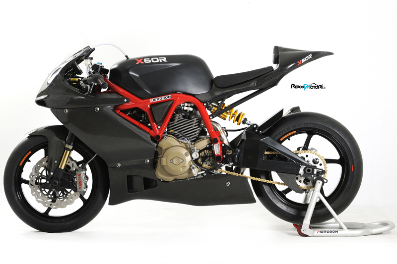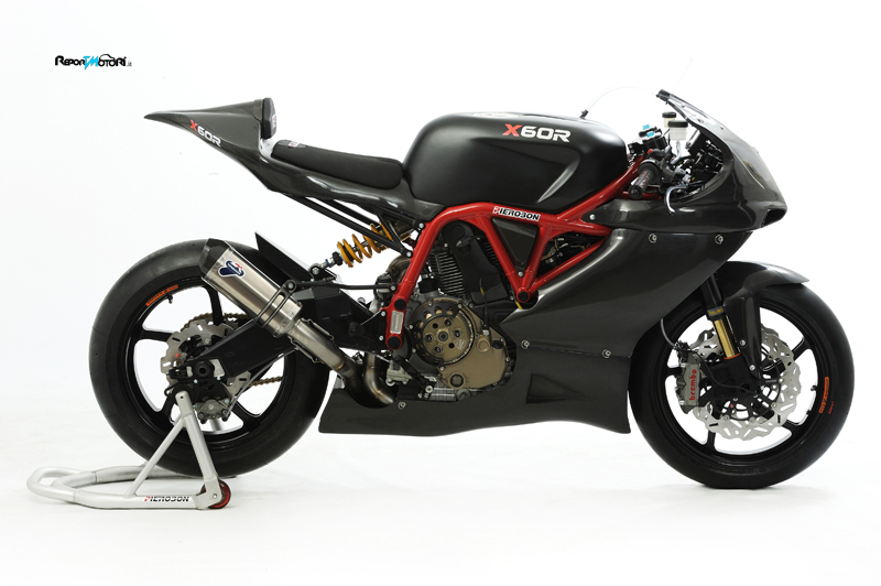 Completamente realizzata a Borgo Panigale, Bologna,la nuova Pierobon X60R è curata in ogni dettaglio, monta il telaio in alluminio che permette la regolazione del fulcro forcellone e del cannotto di sterzo, il forcellone in alluminio scatolato derivato dalla moto Gp, sospensioni Ohlins, freni radiali Brembo, cerchi OZ Racing, carene in fibra di carbonio, strumentazione digitale AIM, centralina EFI e cablaggio dedicati.