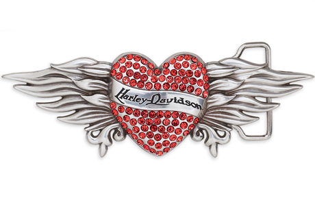 Fibbia in metallo scolpito con cuore centrale in strass rossi e firma Harley-Davidson, raffinatamente incastonati in un abbraccio d’ali. Utilizzabile con tutte le cinture da donna presenti in collezione.