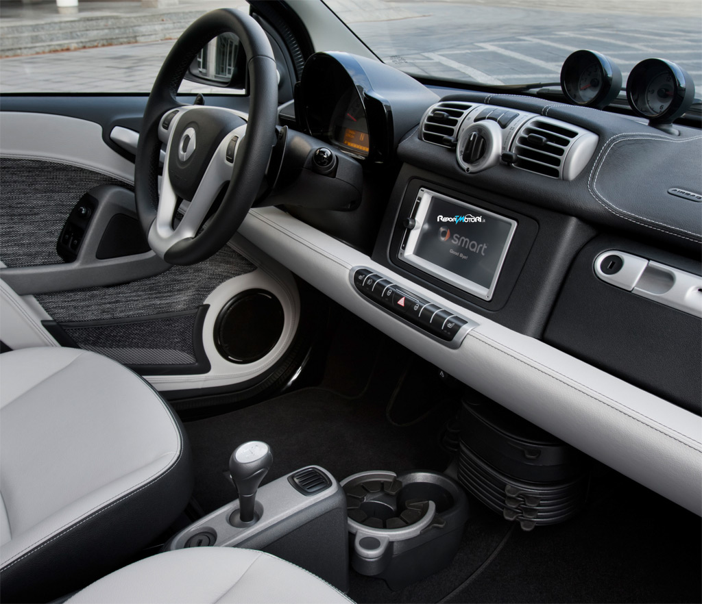 Con la versione 3.0, la scelta dei rivestimenti interni di smart fortwo si arricchisce dal nuovo pacchetto crystal grey. Scegliendo questa opzione, un’elegante combinazione di pelle e tessuto sui toni del grigio perla riveste di esclusività sedili, pannelli interni delle porte e sezione inferiore della plancia, mentre la parte superiore della stessa presenta uno sportivo rivestimento in pelle ecologica nera, sempre con doppia cucitura a contrasto. Questo esclusivo pacchetto di rivestimenti interni è disponibile per le versioni pure, pulse, passion e BRABUS.