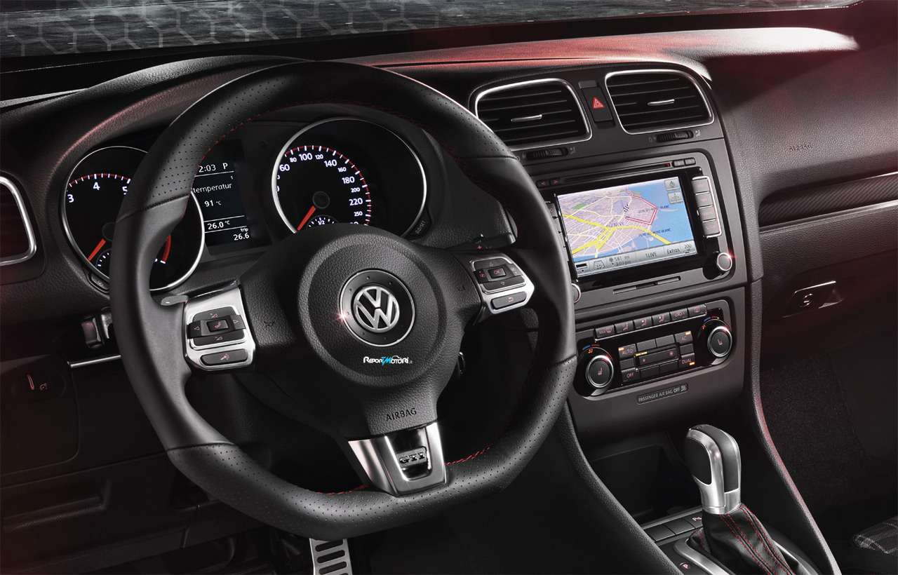 L’abitacolo della Cabriolet presenta elementi classici del design della Golf (dal telaio del parabrezza fortemente inclinato allo speciale divano posteriore). Della dotazione di serie fanno parte i sedili sportivi con il classico e intramontabile rivestimento sportivo in tessuto scozzese Jacky. I sedili rivestiti in pelle Vienna sono disponibili a richiesta. Nei sedili è integrato il supporto lombare, regolabile mediante una leva posta accanto al sedile. In aggiunta a tutto questo, naturalmente, la GTI Cabriolet vanta numerose particolarità tipiche GTI: pedaliera in acciaio inox spazzolato, leva del cambio specifica GTI in look alluminio, volante rivestito in pelle con impugnatura ergonomica e logo GTI, cuciture decorative rosse sul rivestimento in pelle