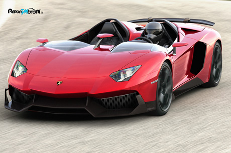 Rosso con effetto cromo, cerchi con convogliatore in fibra di carbonio L’esterno della vettura mostra una cospicua presenza del colore nero dei componenti in fibra di carbonio a vista. Le minigonne nettamente più larghe e il voluminoso diffusore posteriore si mettono in raffinato contrasto con il rosso della verniciatura esterna. La tonalità, un rosso particolarmente intenso e dotato di un leggero effetto cromo, è stato realizzato appositamente per questo modello. Ovviamente anche i cerchi sono stati studiati in modo dedicato, con 20 pollici di dimensione all’anteriore e 21 pollici al posteriore. I cerchi in lega d’alluminio con disegno a cinque razze sono dotati di monodado o fissaggio centrale nonché di un inserto in fibra di carbonio, che funge da piccolo convogliatore per assicurare una ventilazione ottimale dei freni. Naturalmente le porte dell’Aventador J si aprono verso l’alto, sono decisamente più piatte di quelle dell’Aventador e sono dotate di un piccolo vetro laterale fisso. Le voluminose fiancate posteriori si presentano come tradizione Lamborghini vuole.