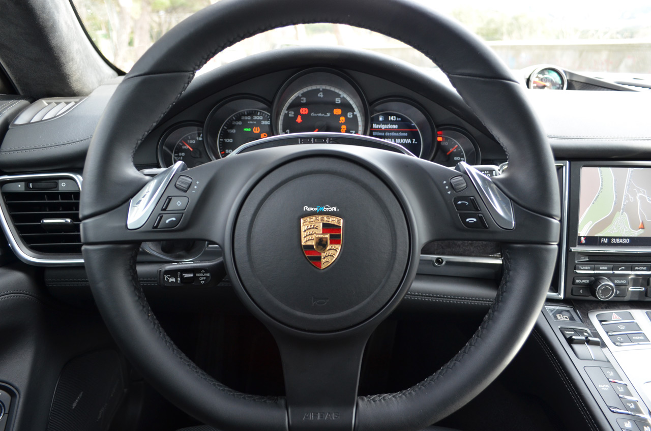 La Porsche Panamera Turbo S oggetto del nostro consueto test drive, esibisce uno sportivo quanto elegante abito bianco, cui fanno da contraltare le poderose pinze freno rosse e una silouhette degna della più conturbante modella taglia 46. Giunonica, esageratamente lunga e larga, le dimensioni sono generose ma una volta alla guida ti chiedi il come ed il perché riesce ad esser così performante ed agile. Il suo avantreno è fedele in ogni inserimento di curva, pennelli i tornanti con una facilità incredibile, sicuro che sia una vera Porsche….perché realmente lo è!