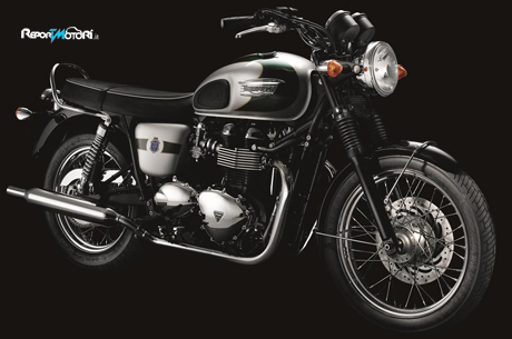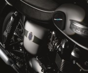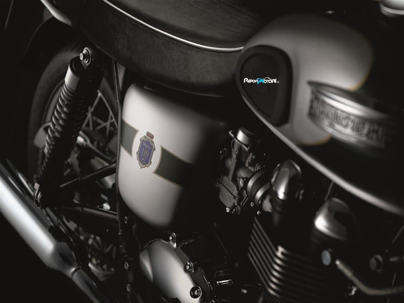 Nel dettaglio La livrea del modello per il 110 anniversario comprende una decalcomania sui fianchetti laterali e una targhetta numerata sulla piastra del manubrio “dog-bone”. Sulla moto c’è anche uno stemma dedicato all’anniversario ispirato ai primi marchi sul serbatoio applicati da Triumph. Lo stemma mostra una corona, tre punti a rappresentare le tre località storiche di Coventry, Meriden e Hinckley e il classico triangolo di Triumph all’interno della corona. L’esclusiva verniciatura bicolore insieme a un pizzico di accessori cromati aumenta ulteriormente il fascino di questa edizione speciale, distinguendola da un modello di serie. Il nome stesso della colorazione, Brooklands Green, celebra la prima gara motociclistica vinta da Triumph nel 1908 sul famoso circuito di Brooklands, il primo circuito al mondo costruito appositamente per le competizioni motoristiche. E a completare questo look unico troviamo gli accessori cromati in esclusiva per questa edizione speciale: copricatena, maniglia passeggero e coperchio distribuzione. La T100 anniversario verrà commercializzata a partire da giugno 2012.