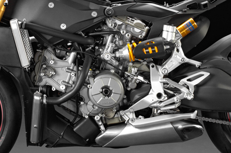 Se per i cilindri è stata mantenuta la configurazione bicilindrica a L a 90° caratteristica di Ducati, la parte termica del nuovo motore è stata ruotata all’indietro di altri 6° intorno all’albero motore per consentire agli ingegneri di modificare l’equilibro dei pesi tra anteriore e posteriore.