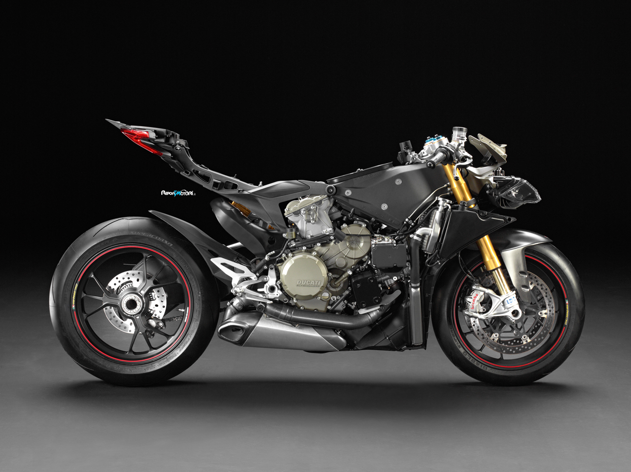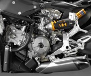 Ciò consente inoltre una geometria di sterzo con 24,5° di inclinazione del cannotto e 100mm di avancorsa. Il nuovo forcellone monobraccio, interamente realizzato in fusioni d’alluminio, è fissato direttamente alla parte posteriore del motore ed è più lungo di 39mm rispetto alla 1198, contribuendo ad incrementare l’interasse a 1.437mm e portando la distribuzione dei pesi sulla 1199 Panigale dal 50/50 a 52% all’anteriore e 48% al posteriore per un pilota di media corporatura.