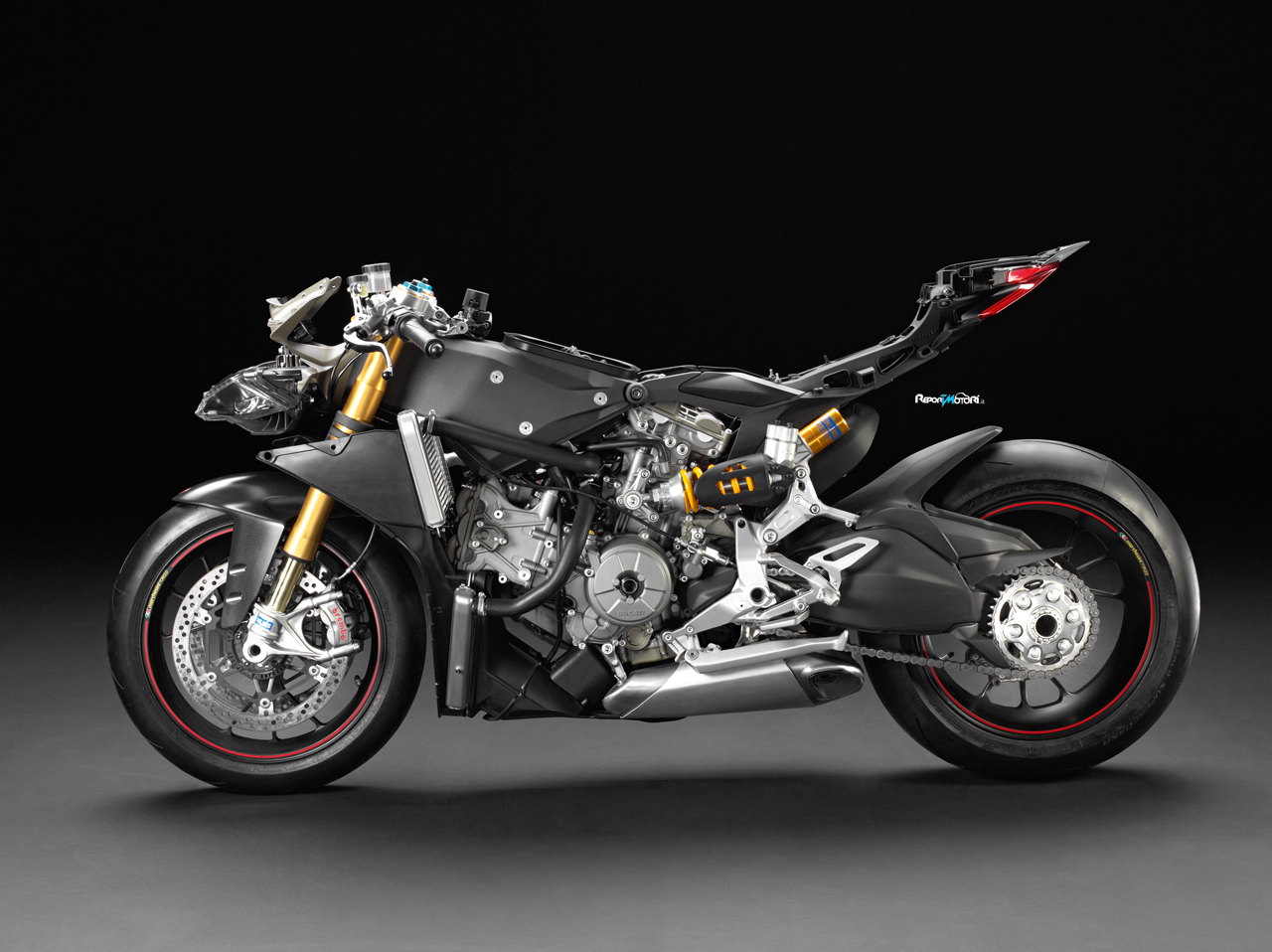 Oltre ad assolvere alla funzione classica di telaio, il monoscocca funge anche da airbox (al suo interno sono infatti alloggiati, oltre al filtro dell’aria, i corpi farfallati ed il circuito carburante completo di iniettori), sfruttano il fondo del serbatoio in alluminio, alleggerito di 1,9kg rispetto a quello del 1198, come coperchio di chiusura. Questo, per riuscire ancora una volta nell’impresa di utilizzare un solo componente per svolgere le funzioni di due.