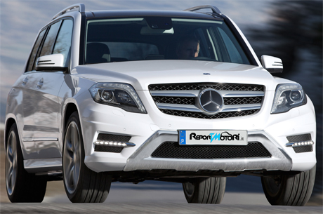I paraurti non sono più differenziati in base ai pacchetti specifici On-Road e Off-Road e tutti i modelli, al disotto dei nuovi proiettori, dispongono delle luci diurne a LED di serie, integrate in una modanatura cromata. La mascherina del radiatore a due lamelle con Stella centrale segue il linguaggio formale di tutti gli attuali modelli della Stella. Le lamelle sono verniciate color argento e impreziosite da inserti cromati. I proiettori principali reinterpretano il tipico design delle luci Mercedes. Nella versione Sport dotata di fari con sistema di riflessione della luce, una sorta di “fiaccola cromata” si estende sui due riflettori come elemento decorativo. Se la vettura è equipaggiata con l’Intelligent Light System (ILS), di serie per la versione Premium, il faro è composto dal gruppo di proiezione, da un riflettore e dalla “fiaccola” con fotoconduttori a LED per le luci di posizione, come pure dagli indicatori di direzione sovrastanti con LED singoli. Nella vista laterale spiccano in particolare i roof rail completamente rinnovati. Il paraurti posteriore conferisce alla coda della GLK un’immagine sportiva e al tempo stesso raffinata. Qui si nota in particolare il nuovo design della protezione antincastro e i terminali di scarico cromati di serie. I gruppi ottici posteriori sono stati completamente rinnovati dai designer dal punto di vista sia estetico che funzionale. Attraverso l’utilizzo di fotoconduttori e LED, la coda della GLK presenta un design notturno unico nel suo genere e caratteristico, ulteriormente sottolineato dalla nuova luce della targa a LED.
