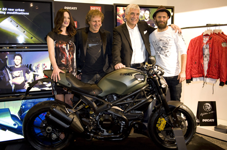 Dopo l’evento di New York, dove la settimana scorsa, in anteprima mondiale, è stata presentata l’inedita versione del Ducati Monster Diesel e la linea di abbigliamento Diesel “capsule collection” dedicata alla casa bolognese, non poteva mancare un appuntamento italiano. La serata è stata organizzata giovedì 22 marzo, all’interno del Diesel Store della centralissima via del corso a Roma. Un vero e proprio happening che ha richiamato molti amici e fan di entrambi i marchi che, insieme a Gabriele Del Torchio Presidente di Ducati Motor Holding e Renzo Rosso fondatore della Diesel, hanno presentato sia il Monster Diesel che la collezione dedicata a Ducati. La serata è stata caratterizzata da molti VIP e celebrities che hanno reso ancora più glamour l’evento, tra i quali Fiorello, Asia Argento, Valerio Staffelli, Claudia Pandolfi, Carolina Crescentini e Ringo oltre alla stampa italiana e molti amici, sia per Ducati che per Diesel. I due brand italiani hanno celebrato questo nuovo, importante capitolo della loro partnership accomunati dalla creatività e l’innovazione, elementi chiave che fanno delle due aziende icone del “Made in Italy” nel mondo. Per quanto riguarda la moto, la base da cui si è partiti per realizzare il nuovo Monster Diesel è la versione 1100EVO, modello di punta della famiglia Monster. Il progetto ha visto un’efficace e diretta collaborazione tra il team creativo di Renzo Rosso, fondatore di Diesel, e il Ducati Design Centre. Una linea guida precisa ed efficace che ha orientato i progettisti verso un tema di ispirazione militare, realizzando un prodotto all’avanguardia. Esaltata dallo speciale trattamento nero del telaio a traliccio Ducati, dei cerchi, dei carter motore, dello scarico e della forcella, l’esclusiva livrea verde opaco “Diesel Brave Green matte” richiama l’aspetto rude ed essenziale dei mezzi militari, mentre la finitura giallo shocking delle pinze freni anteriori sottolinea il carattere performante di questo modello.