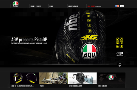 Nel 2012 AGV festeggia 65 anni e per l’occasione rinnova completamente il proprio sito istituzionale. Un restyling grafico e strutturale per vivere il mondo AGV a 360 gradi. La piattaforma ha un look fresco e moderno ed è stata arricchita di nuove funzioni per aumentare la navigabilità e la velocità di ricerca. Il nuovo sito è uno strumento di facilissima consultazione che si articola secondo due logiche principali: il menù generico e i prodotti. Il menù principale raccoglie tutte le informazioni sull’azienda: dalla mission alla sua storia, dai campioni del passato ai testimonial di oggi fino al reparto ricerca e sviluppo, che sa fondere tecnologia e design per dar vita ai progetti innovativi che rendono da sempre AGV leader del mondo caschi. Un’ampia area è stata riservata alle news aziendali oltre ad una sezione interamente focalizzata sui punti vendita. La sezione prodotti è interamente dedicata alle collezioni AGV. I prodotti sono suddivisi in categorie in cui ogni mondo rappresenta una modalità d’uso: racing, gt, street, city e offroad. Una volta selezionato il casco si può direttamente accedere alla scheda tecnica e alle varianti colore in cui è disponibile. In homepage troviamo una sezione dedicata a AGV Standards, il processo rivoluzionario di progettazione dei caschi cha ha portato alla nascita del PistaGP, capostipite di una nuova generazione di prodotti nel mondo dei caschi.