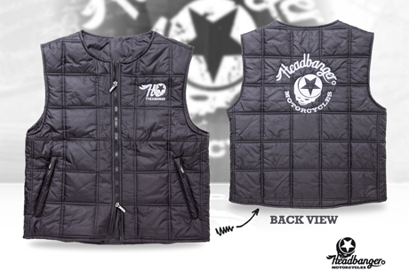 Headbanger è vita da vivere intensamente, il coraggio di essere se stessi, di non preoccuparsi dell’apparenza ma dell’essere, ha lo spirito della musica rock più pura. Per chi non si adagia alle consuetudini, Headbanger ha realizzato una propria collezione di abbigliamento (uomo/donna) e accessori che sono prodotti sempre in pochi esemplari, semplici, primitivi, mai ‘lenti’. Oggi la collezione Headbanger 2012, presentata in anteprima lo scorso novembre ad Eicma, si arricchisce di un nuovo gilet trapuntato disponibile per tutti gli appassionati del Marchio, realizzato su disegno e specifiche esclusive HB e ‘made in Italy’. Il gilet è realizzato in nylon 100% con trattamento WR, antivento e antiacqua, fodera interna in nylon 100% PA, imbottitura Thermor 180 gr. Disponibile nella colorazione nera, il gilet sfoggia una personalizzazione raffinata con logo Headbanger ricamato in filatura argento sul petto e sulla schiena. La doppia zip centrale e le zip tasche sfoggiano piccoli tirazip personalizzati con la scritta Headbanger Motorcycles. Completa il gilet una pratica tasca interna che consente di posizionare piccoli oggetti.